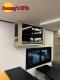 - Interior: Functional kitchen area, dinette, entertainment space, and bathroom.